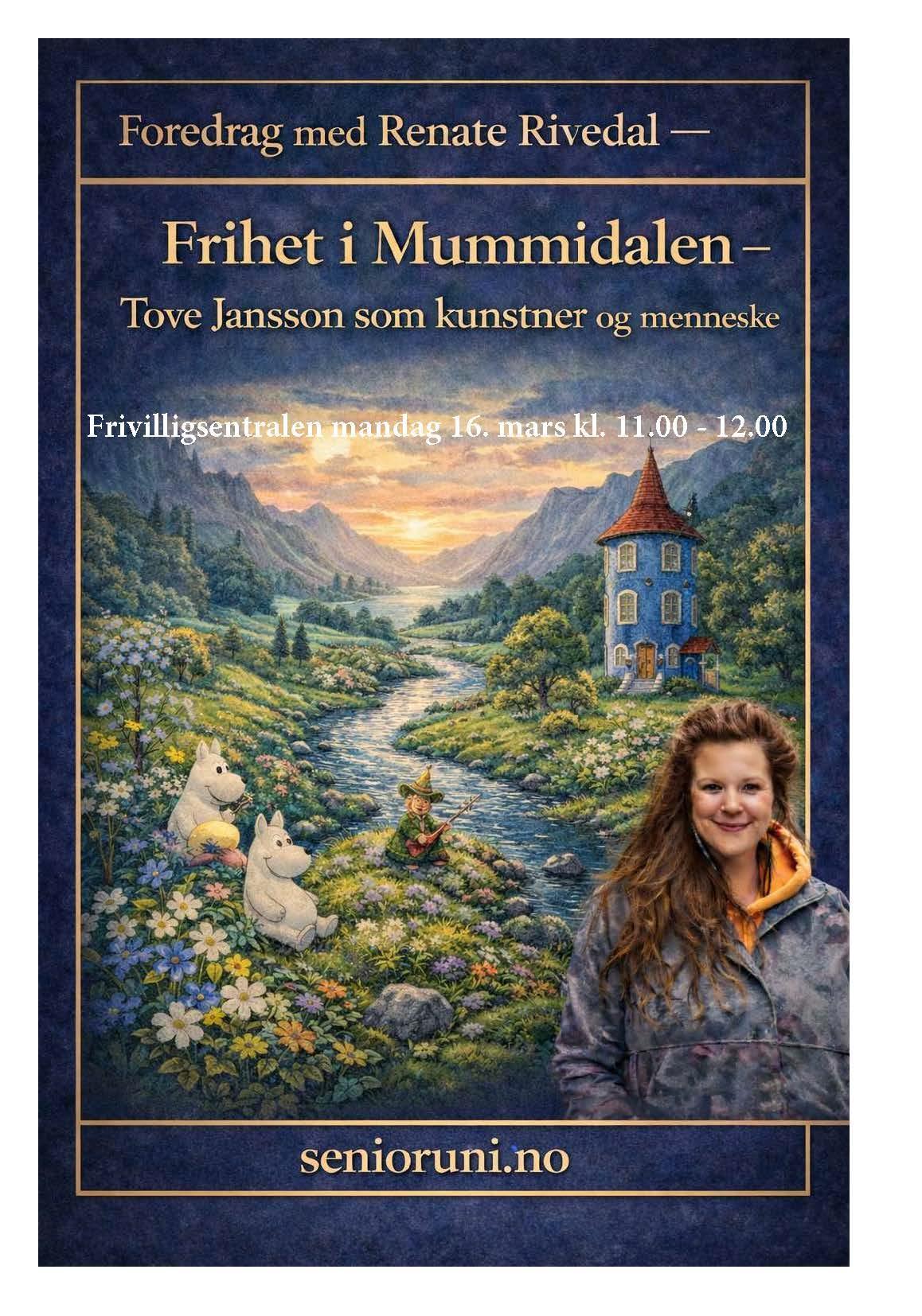 Foredrag på frivilligsentralenAnnenhver mandag kl. 11.00 kan du sammen med dine venner og samtalepartnere få med deg et aktuelt tema på frivilligsentralen. Mandag 16. mars blir det et foredrag om Tove Jansson. Publisert av Finn Terje Uberg Ansvarlig Finn Terje Uberg Publisert 02.03.2026 15:09 Sist endret 12.03.2026 14:48 Aktuelle foredrag fra Senioruniversitetet:SeniorUni tilbyr kvalitetsforedrag for deg som vil forstå mer av verden (referanse egne nettsider).Annenhver mandag kl. 11.00 vil Thor Olav Reiersdal tilby disse digitale foredragene direkte i lokalene til Iveland frivilligsentral. Vi håper at mange vil ta turen og få med seg disse foredragene som tar ca 45 minutter. En varm kaffekopp blir servert. Det vil være mulig å sende inn spørsmål til foredragsholderen ettersom dette skjer direkte. En liten samtale i etterkant kan også være hyggelig før den tradisjonelle lunsjen serveres kl. 12.30. En hyggelig start på uken!Kommende program:Kommende program:Mandag 16. mars kl. 11.00: “Frihet i Mummidalen - Tove Jansson som kunstner og menneske"Mandag 23. mars kl. 14.00 (merk tiden): “Hvordan ble propaganda og myter brukt i antikkens Roma”Mandag 13. april: “Livets opprinnelse - Teorien om hvordan alt oppstod"Informasjon om foredraget 16. marsInformasjon om foredraget23. marsInformasjon om foredraget13. aprilLokal kontaktperson:Thor Olav Reiersdal: 414 82 383SeniorUni - hvem er vi og program for 2026Frihet i Mummidalen – Tove Jansson som kunstner og menneske; Renate Rivedal forteller Arnt Stefansen vil snakke om hvordan propaganda og myter ble brukt i antikkens RomaTeorien om hvordan alt oppsto og utviklet seg