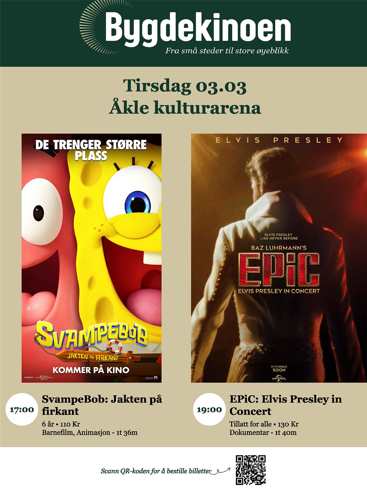 Kinokveld tirsdag 3. mars“SvampeBob" og “Elvis" står på kjøreplanen tirsdag 3. mars. Publisert av Finn Terje Uberg Ansvarlig Finn Terje Uberg Publisert 13.02.2026 09:03 Sist endret 13.02.2026 09:11 Kl. 17:00: “SvampeBob - Jakten på firkant”Kl. 19.00: “Elvis Presley in Concert”Velkommen til bygdekino på Åkle tirsdag 3. mars
