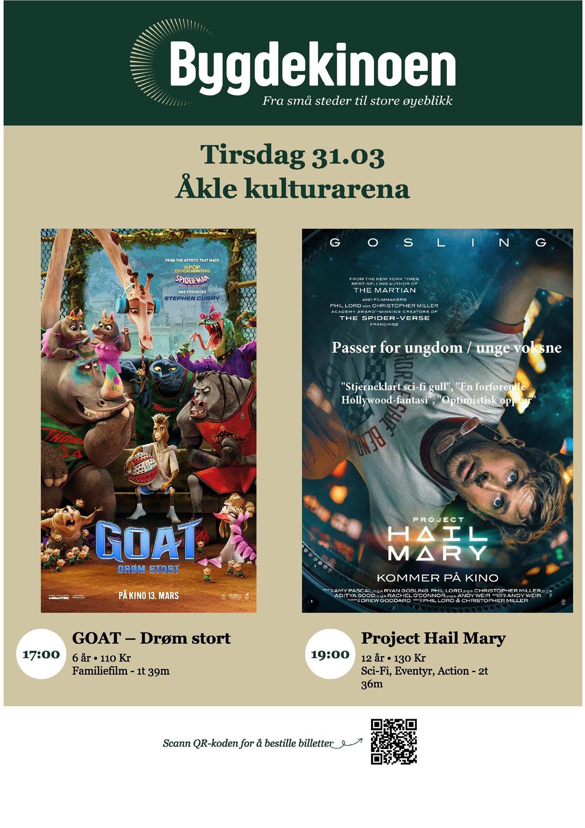 Kinokveld tirsdag 31. mars“GOAT" og “Project Hail Mary" står på kjøreplanen tirsdag 31. mars. Publisert av Finn Terje Uberg Ansvarlig Finn Terje Uberg Publisert 26.03.2026 14:09 Sist endret 26.03.2026 15:17 Kl. 17:00: “GOAT - Drøm stort”Kl. 19.00: “Project Hail Mary”Tirsdag 31. mars går vi på kino