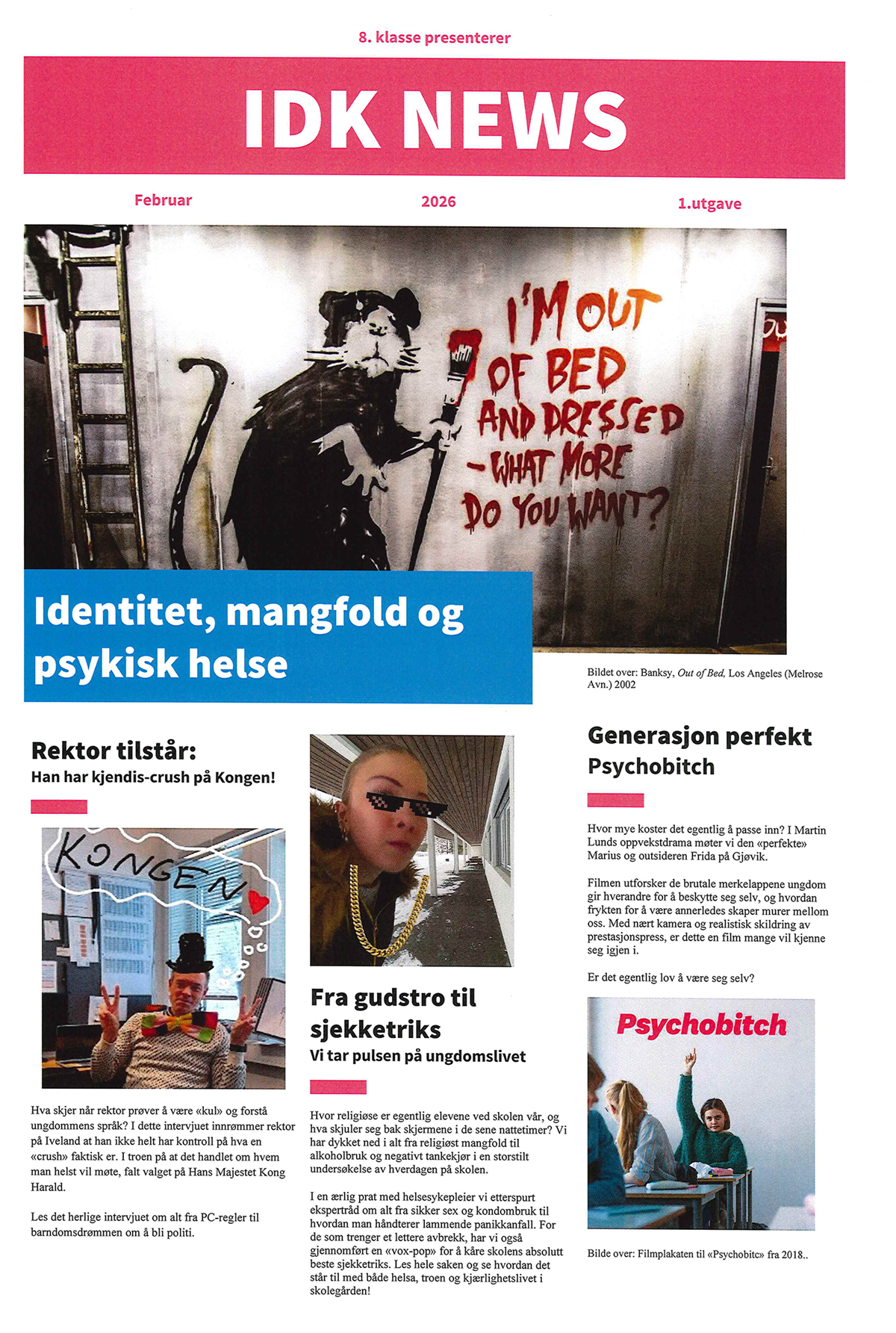 8. trinn har jobbet i to uker med dette avis prosjektet, der identitet, mangfold og psykisk helse har vært i fokus. Elevene har gjort undersøkelser, gjennomført intervjuer og jobbet tverrfaglig for å få dette prosjektet i havn, med kyndig veiledning fra Silje Haukom Wick.