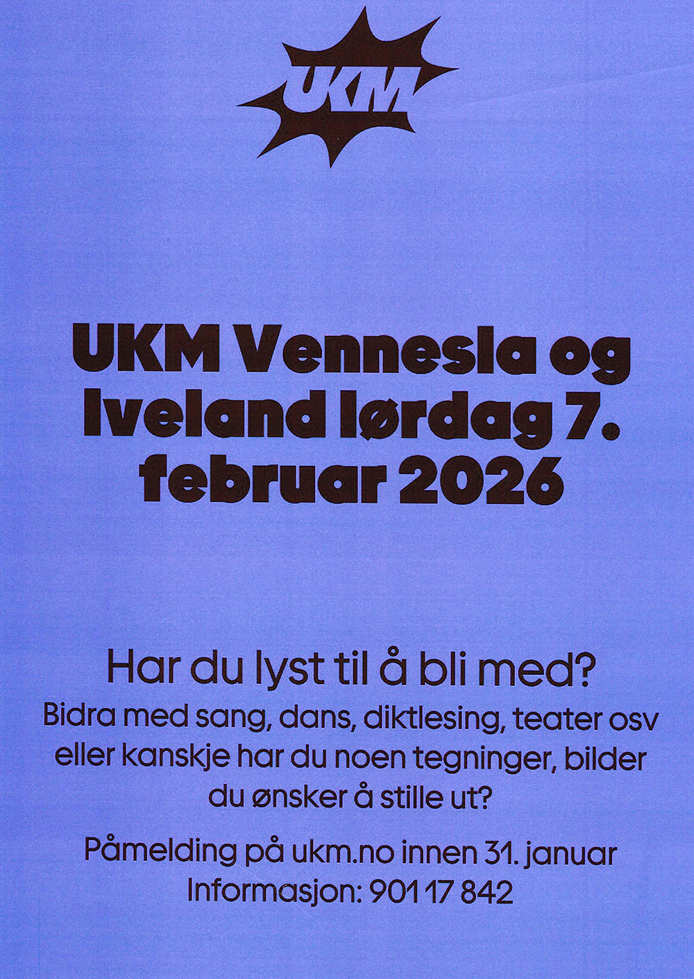 Ungdommens festkveld 7. februarUKM (Ung Kultur Møtes - tidl. Ungdommens Kulturmønstring) avholdes i Vennesla samfunnshus lørdag 7. februar. Påmeldingsfristen er 31. januar. Publisert av Finn Terje Uberg Ansvarlig Finn Terje Uberg Publisert 13.01.2026 11:26 Sist endret 13.01.2026 12:05 Ungdommenes festkveld:Ung Kultur Møtes (UKM) er for alle barn og ungdom mellom 10-20 år. Alt som kan stilles ut i en utstilling eller fremføres på en scene er innslag vi ønsker velkomne!Stikkord:Alder 10-20 år (mange steder har 13-20 år, men vi har inkludert de yngste)Gratis Lørdag 7. februar kl. 18.00 - UKM i Vennesla samfunnshus. Kunstutstilling åpner kl. 17.30.Påmelding på ukm.no Håper du blir med!Velkommen som deltaker på UKM - påmeldingsfristen er 31. januar