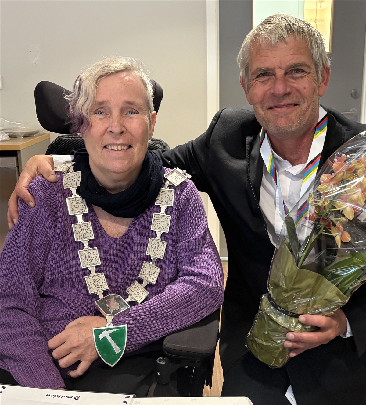 Vi har faktisk verdens nest sprekeste Road Worlds syklist i Iveland! Vi gratulerer Turid Gundersen med en fantastisk innsats. Her sammen med en fornøyd ordfører Jan André Myhren