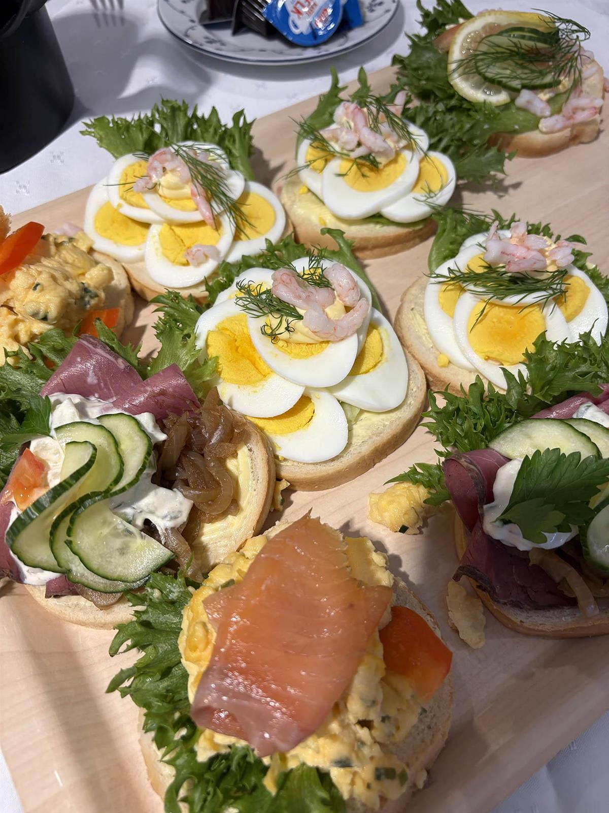 Kjøkkenet serverte snitter og kake og det ble naturligvis god stemning rundt bordene!