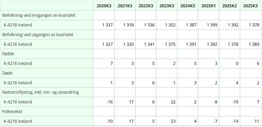 Vi er 1389 innbyggere Innbyggertallet i Iveland kommune har hatt en positiv utvikling i 3. kvartal, og håper å nå 1400 innbyggere om ikke så lenge. Publisert av Finn Terje Uberg Ansvarlig Egil Mølland Publisert 21.11.2025 08:39 Sist endret 21.11.2025 08:42 Heimreneskilen boligfelt ved Vatnestrøm JS Norge / Per Arne Kvamsø Netto innflytting og flere fødsler gir positiv utvikling:Statistisk Sentralbyrå presenterte nylig innbyggertall pr 30. september 2025. Vi har hatt en stabil økning i innbyggertall de siste 2-5 årene, men dette har jevnet seg ut de to siste årene. Siste kvartal var derimot veldig positiv med både seks fødsler og netto innflytting.Tabellen under viser utvalgt statistikk fra 2025, og et fokus på tallene pr 30. september de fem siste årene.Vi nærmer oss 1400 innbyggereLes mer på SSB sine hjemmesiderLedige tomter i og utenfor boligfelt:Dersom du kunne tenke deg å flytte til Iveland kommune, må du gjerne ta en titt på alle våre muligheter med tomter i boligfelt og utenfor boligfelt. Bildet øverst er fra Heimreneskilen ved Vatnestrøm; et idyllisk område et steinkast fra Ogge.Boligtilskudd:Iveland kommune tilbyr boligtilskudd for bygging av eneboliger, tomannsboliger og boliger med flere boenheter. Tomter i og utenfor boligfelt samt boligtilskudd